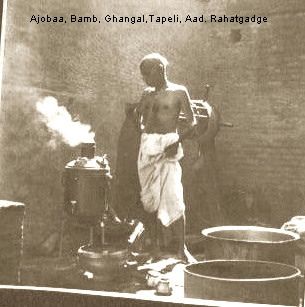 "तर! ते मागे दिसतंय तो रहाट, त्याने पाणी शेंदायचं - विहिरीतून शेंदतो ना तसं. मग ते बंबात घालायचं. बंबातून येणारं गरम पाणी खाली घंगाळात घ्यायचं त्यात 'विसण' घालायची"