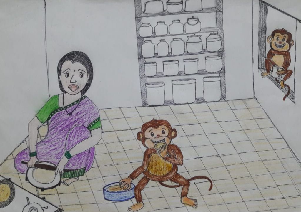 आमी दार लावून टाकतो माकड आली म्हणजे. आदी आमी असे नाय करो, पण माकडाच्या का मनात आलं असलं का त्याईन फळ खान सोडलं अन सैपाक घरात घुसून पोळी गिन तर खान सुरू केलं.