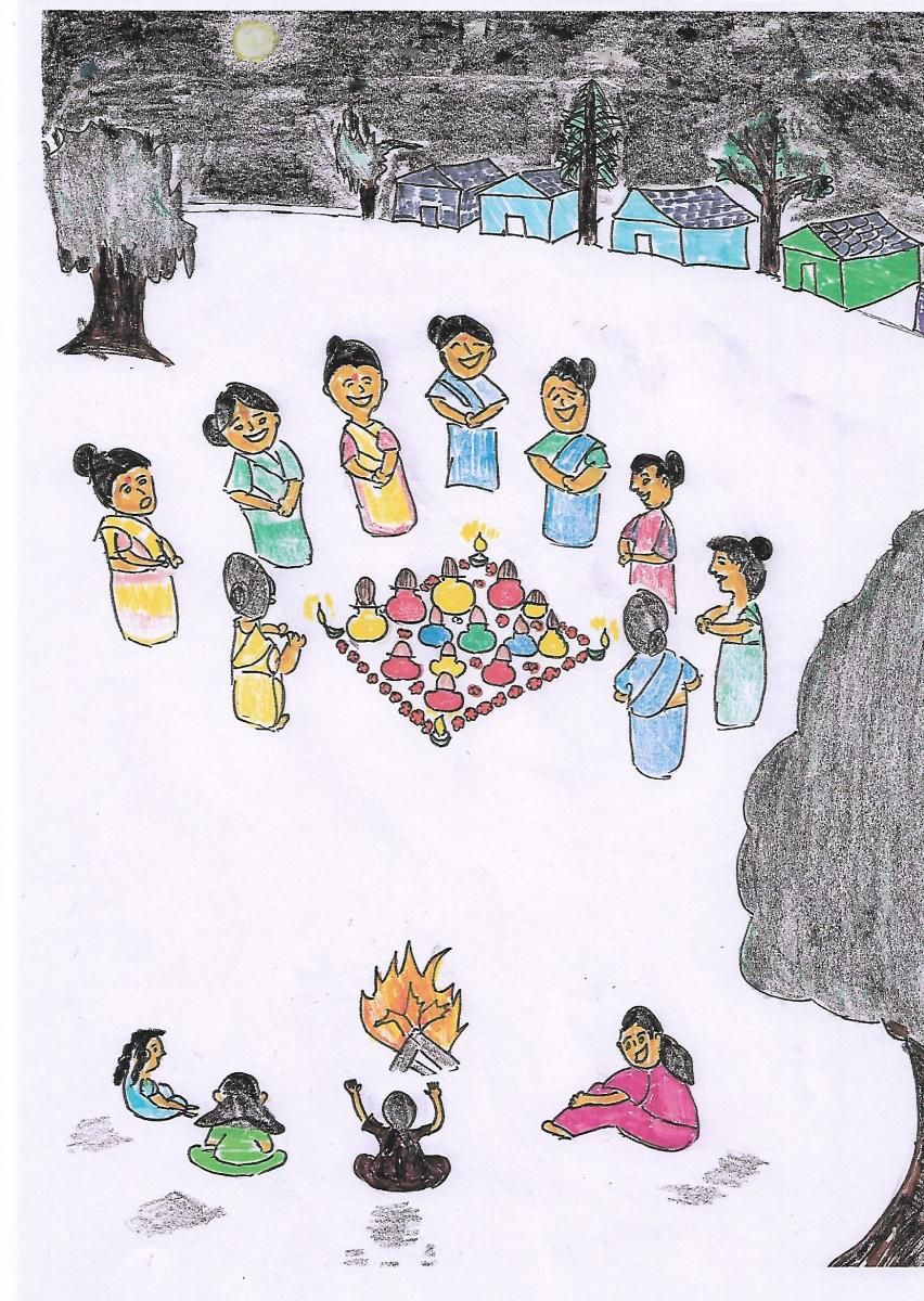 हिवाळ्यात आमच्या गावात रातच्याले बदकम्मा खेळतेत तेलगू बाया अन् आम्ही सगळे पायतो शेकोटीजवळ बसून.