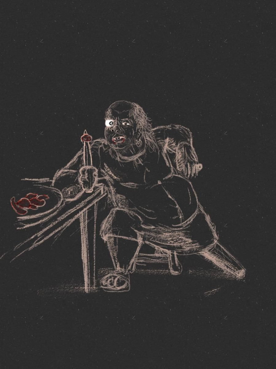 अनोळखी माणूस तिथे गेला आणि त्याने तिथल्या टेबलाचा आणि खुर्चीचा वाकून वास घेतला. या परीक्षेत ती जागा पास झाल्याचं सगळ्यांना लगेचच कळलं. पाहुणा तिथे बसला आणि त्याने आपली खलाश्याची टोपी खाली काढून ठेवली. त्यानंतर त्याने आपला लाल केसांचा टोप सरळ केला. आपल्या समोरची कबाबाची ताटली त्याने पुढ्यात ओढून घेतली आणि साधा डोळा त्याच्या अगदी जवळ नेऊन त्याची सर्व बाजूंनी तपासणी केली. मग आपल्या अंगावर पांघरलेली शाल त्याने मागच्या खुर्चीवर टाकली. अनोळखी पाहुण्याने सैनिक लोक जंगलात कॅमोफ्लॅज होणारे कपडे घालतात तसे कपडे घातले होते. हे पाहून मोठ्या हॉलमधल्या अनेकांची हसण्याची इच्छा झाली पण धाडस मात्र कोणी केलं नाही. पाहुण्याने आपल्या पँटच्या खिशातून एक चाकू काढला आणि त्याने तो कबाब खाऊ लागला. त्याचा साधा डोळा कबाबावर केंद्रित असला, तरी त्याचा निळा डोळा संपूर्ण हॉलमध्ये काहीतरी शोधत असल्यासारखा फिरत होता.