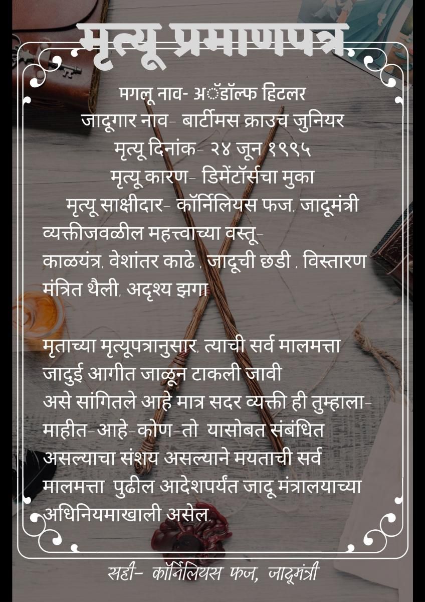 क्राउच किंचित हसला. त्याने एक दीर्घ श्वास घेतला आणि तो निर्विकारपणे बोलायला लागला, “माझं नाव अॅडॉल्फ हिटलर, मी एक मगलू आहे. दुसऱ्या मगलू महायुद्धामध्ये मी एक महत्त्वाची भूमिका बजावली. मगलू इतिहास हा तुम्हा जादूगारांच्या दृष्टीने फारसा महत्त्वाचा नसल्याने मला फार लोक ओळखत नाहीत, किमान या काळात तरी नाही.
