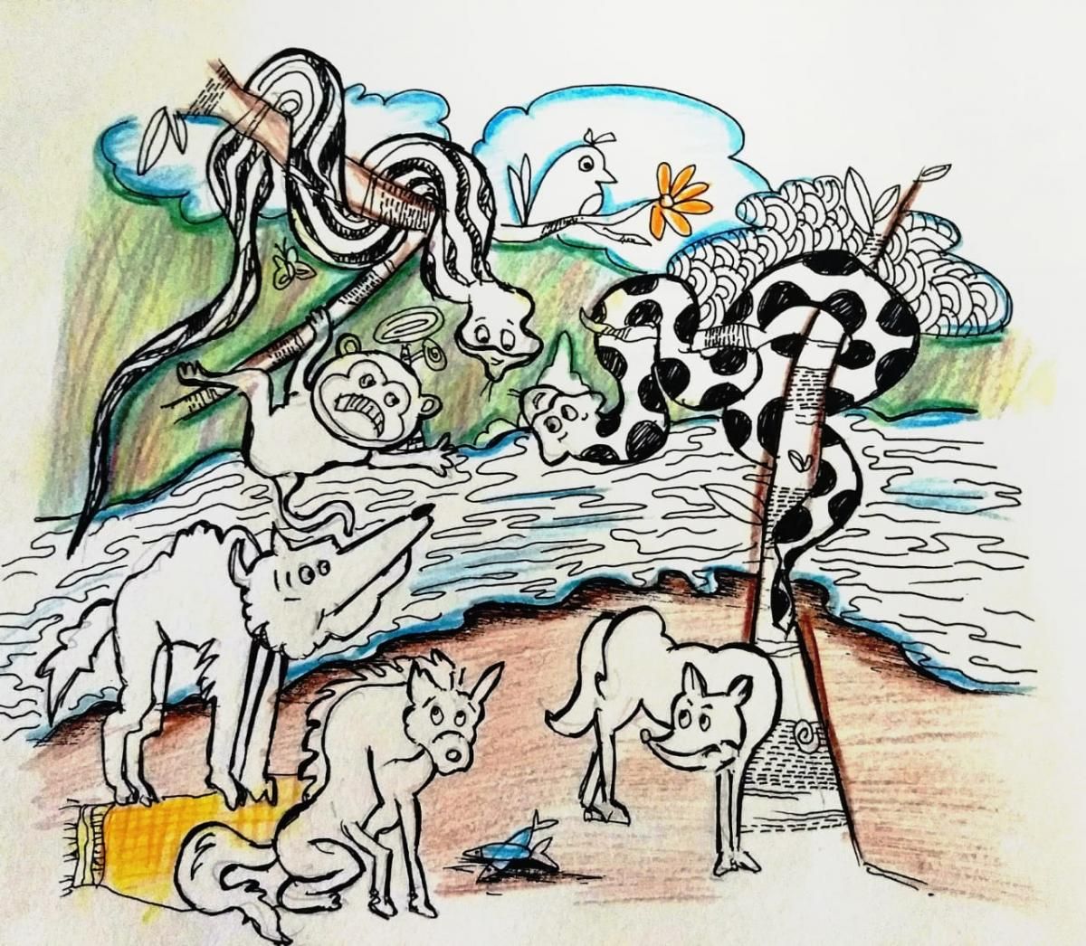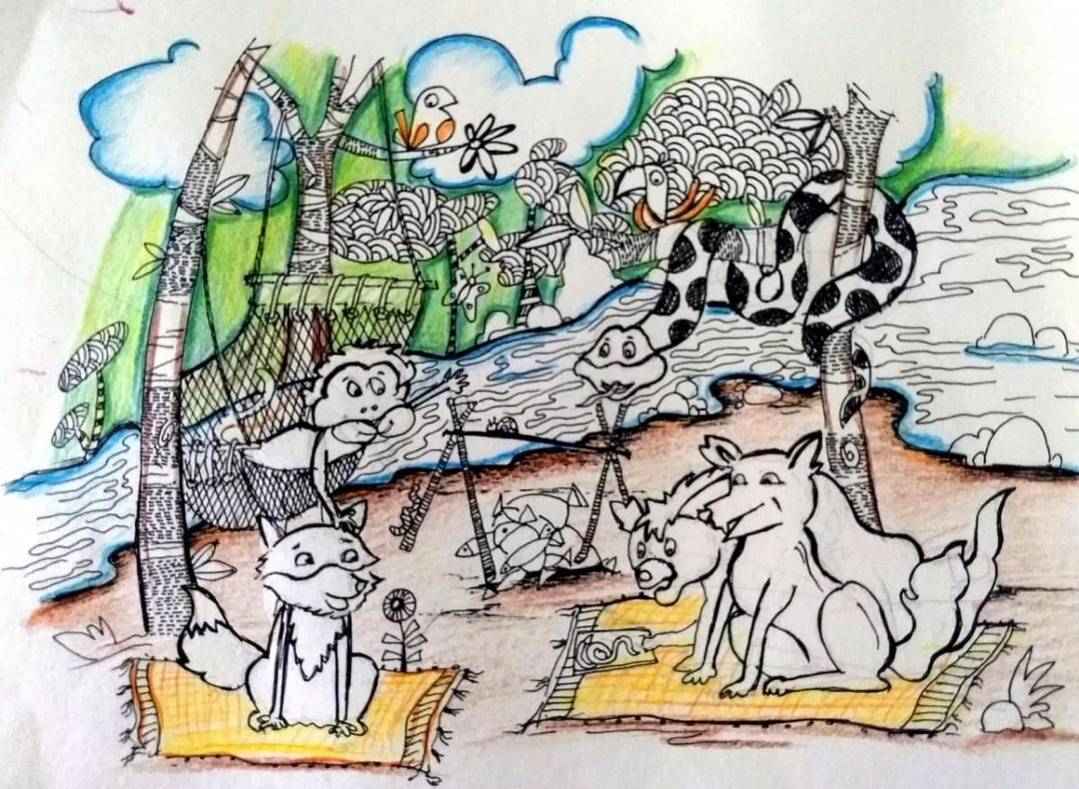 आता तर मात्र अजगराचं अतीच झालं होतं, कारण सगळ्या प्राण्यांना माहीत होतं की, काही वर्षांपूर्वी जंगलात फिरताना अजगराने सिंहाच्या छाव्यावर हल्ला केला होता. त्यानंतर राजा सिंहोबाने अजगराला जंगलात यायलाच बंदी घातली होती. तेव्हापासून अजगराला इथे या नदीकाठी राहावं लागत होतं. पण आपल्याला काय करायचं? असा विचार करत नकट्या कोल्ह्याने माशांच्या ढिगावर नजर फिरवली. ढीग खूप कमी झाला होता. नकट्याच्या लक्षात आलं की, बारक्या तरस त्यांच्या गप्पात लक्ष न घालता फक्त माशांवर ताव मारण्यात मग्न होता. त्याचं एकामागे एक तोंडात मासे टाकणे सुरू होते. अर्धा ढीग तर या बारक्यानेच संपवला असेल आणि आपण बसलो या मूर्ख अजगराच्या थापा ऐकत. बरं, स्वतः अजगराला मासे खाण्यात फार काही रस नव्हता. आतापर्यंत त्याने फार तर फार एक- दोन मासे खाल्ले असतील. त्याला फक्त आपल्या गप्पा ऐकणारे कोणीतरी पाहिजे होते.