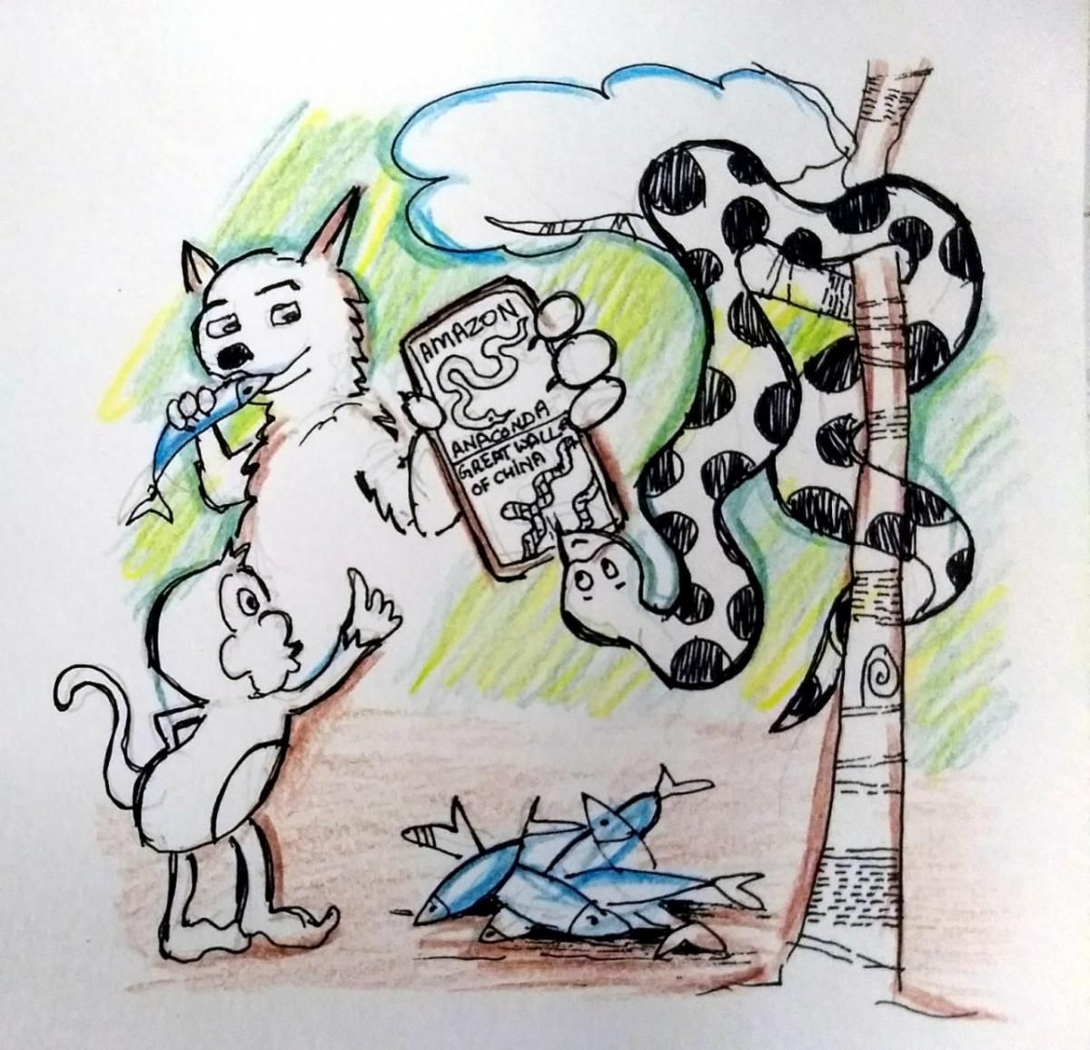 आता मित्रांना होकारार्थी माना हालविण्याशिवाय पर्यायच नव्हता. अमेरिकेतील ऍमेझॉन नदीच्या परिसरात असलेल्या जंगलात महाकाय ऍनाकोंडा साप असतो हे नकटा कोल्हा ऐकून होता. त्यामुळे सदू थापा मारतोय हे त्याच्या लक्षात आलं होतं, पण काही बोलता त्याने एक मासा तोंडात टाकला.
