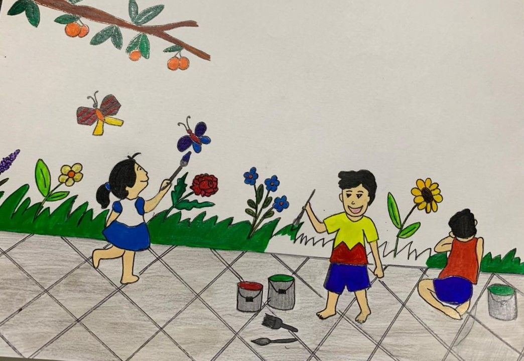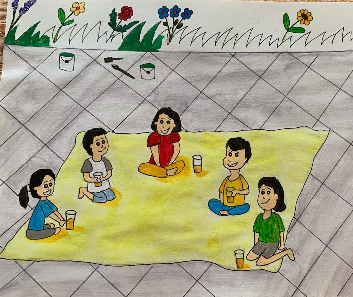 दुसर्या दिवशी आई मदतीला आली. “आओ मैं सिखाती हूं”, म्हणत आईने आणखी दोन मुलांना ब्रश रंगात बुडवून रंग बाहेर जाऊ न देता रंगवायचं कसं ते शिकवलं”