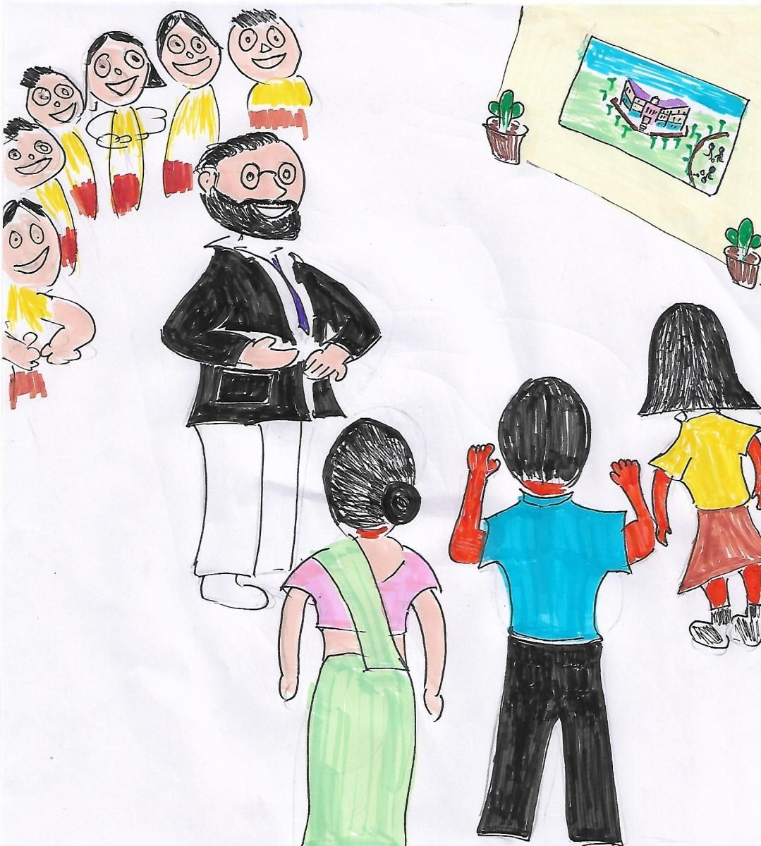 दुसर्या दिवशी बाबा चक्क लवकर उठून तयार होतो. जानकी तर सकाळीच शाळेत गेलेली असते. श्वेत, आई, बाबा तिघंही शाळेत पोचतात. मुख्याध्यापक हसत स्वागत करतात तेव्हा बाबाचं टेंशन जरा कमी होतं. आता त्याला उत्सुकता वाटायला लागते. काय असेल आज? बाकी कोणी पालक तर दिसत नाहीयेत. मग जानकीला वर्गातून बोलावणं पाठवतात. जानकीला पण आई, बाबा, श्वेत सगळ्यांना शाळेत बघून नवल वाटतं. तिघांना शाळेच्या मुख्य इमारतीत नेतात, आणि चित्र लावलेल्या भिंतीसमोर आई-बाबा-जानकीचं अभिनंदन करतात. सगळी मुलं टाळ्यांचा कडकडाट करतात.