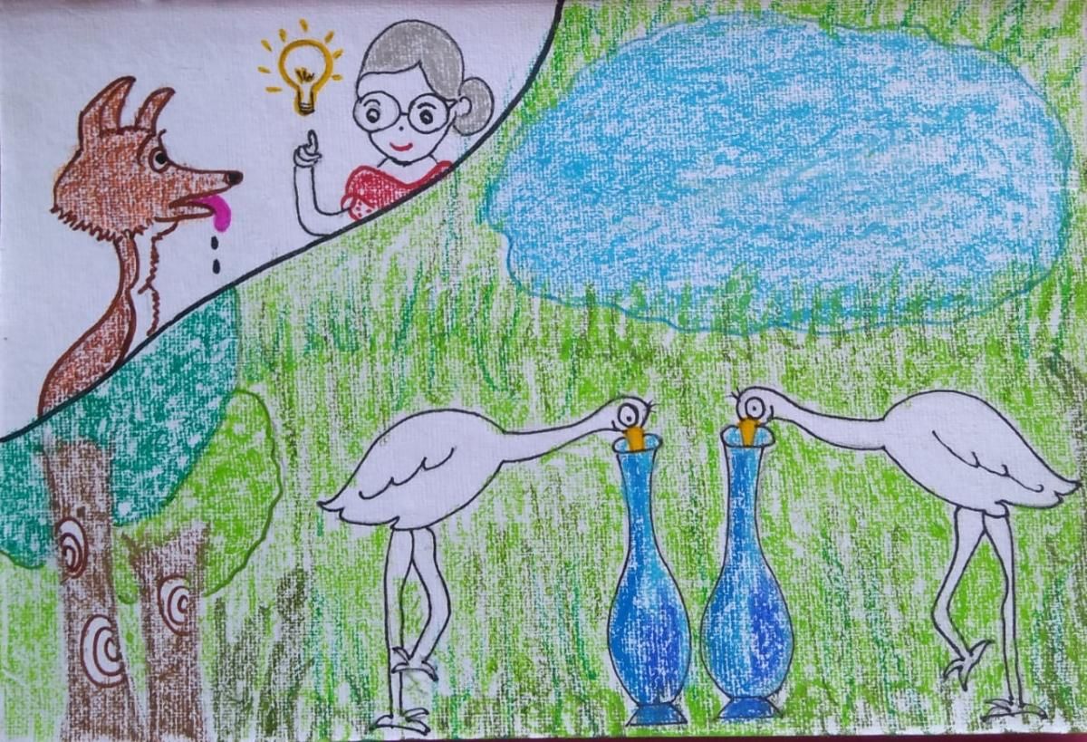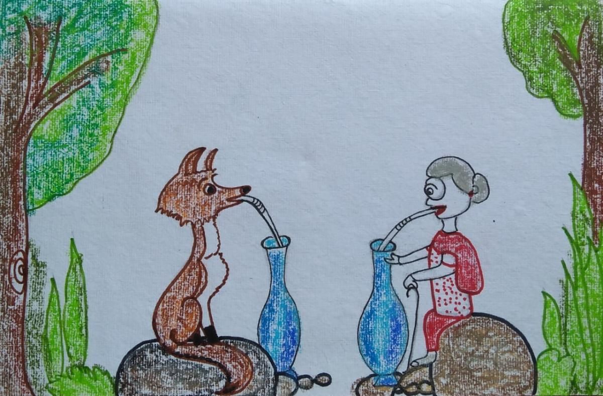 “अरे वा!”, असं म्हणत आजीने पिशवीत दोन ‘स्ट्रॉ’ काढले. एक कोल्ह्याला दिला आणि मजेत खिरीचा आस्वाद घ्यायला सुरुवात केली. कोल्ह्याने आजीकडे पाहिलं. अरेच्च्या, अशी गंमत आहे तर! त्यानेदेखील पोकळ नळीच्या साहाय्याने खीर प्यायला सुरुवात केली.