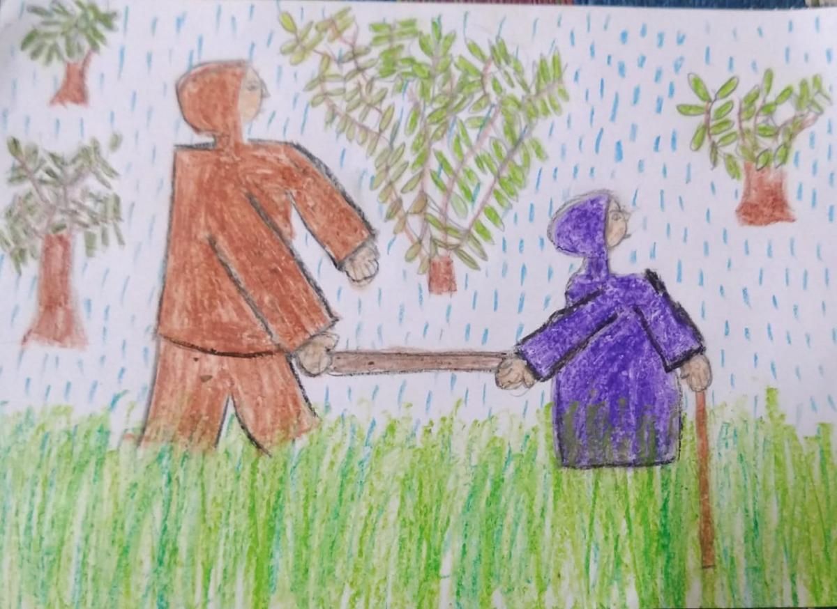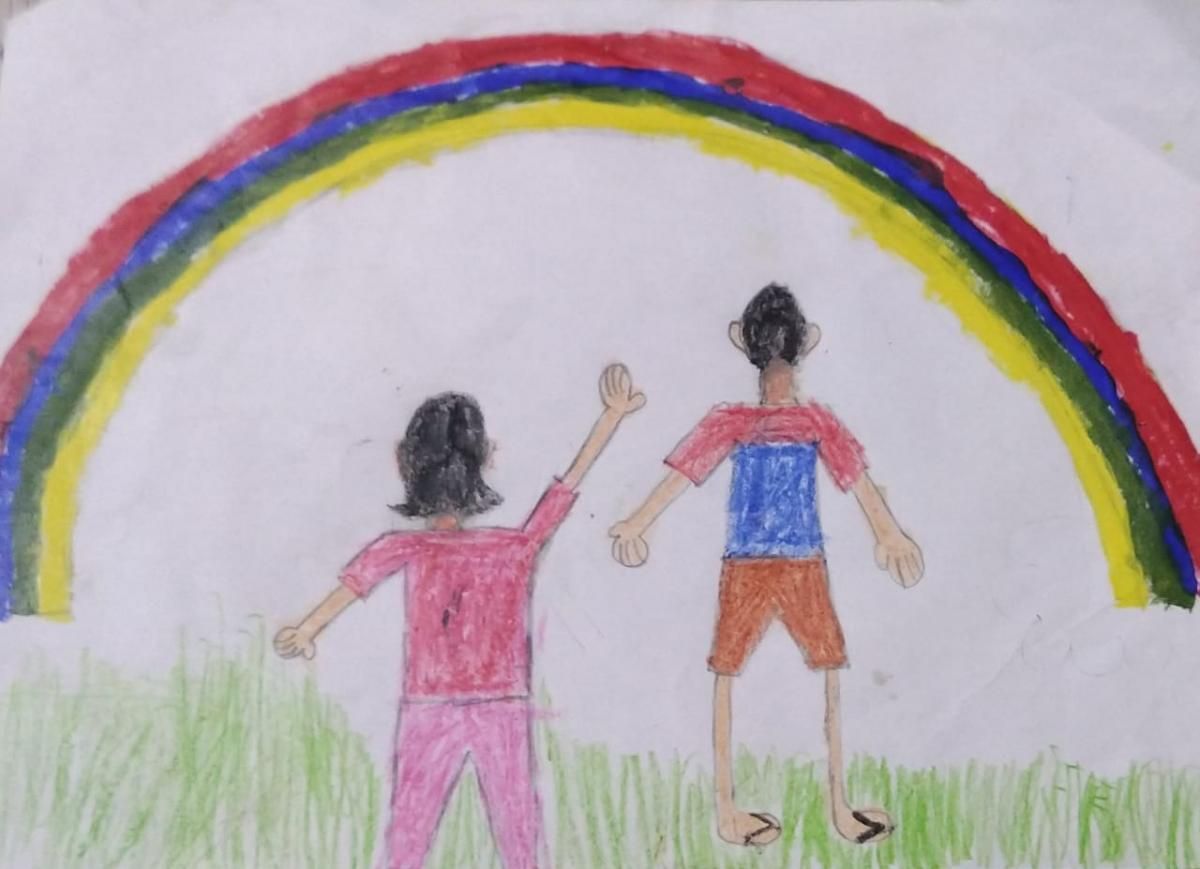 एके दिवशी मी आणि बाबा तळ्याकाठी बसलेलो तर काय! आकाशात इंद्रधनुष्य! आम्हाला खूप आनंद झाला. आम्ही घरी जायला निघालो आणि काय! मुसळधार पाऊस सुरू झाला. आम्ही रेनकोट घातले. आमच्याकडे एक छोटी काठी आणि मोठी काठीसुद्धा होती. गवतातून चालताना मोठ्या काठीचं एक टोक बाबांनी धरलं आणि मी दुसरं टोक धरलं. माझ्या दुसऱ्या हातात छोटी काठी धरली. आम्ही हळूहळू स्कूटरपाशी आलो आणि घरी गेलो.