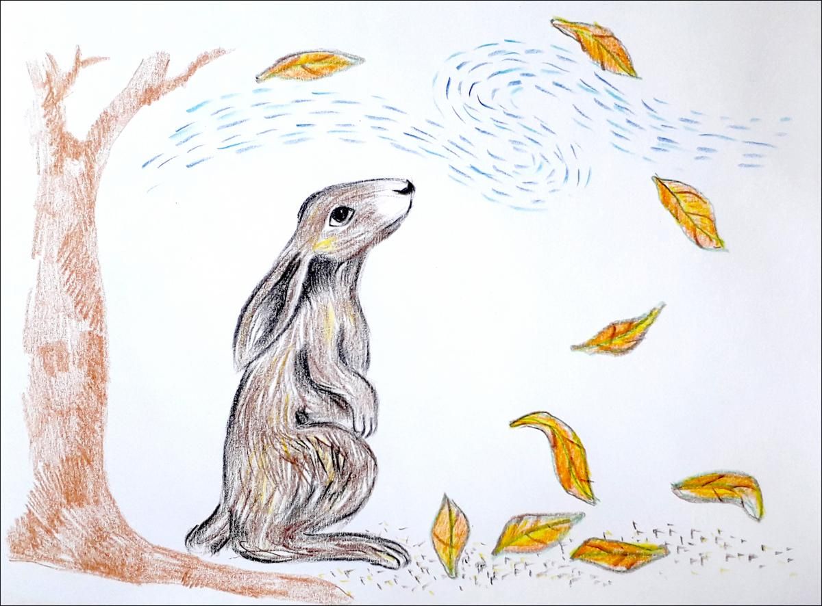 त्या पानाकडे ससा बघत होता, तेवढ्यात वाऱ्याची मोठ्ठी झुळूक आली आणि आणखी पानं खाली पडली. एक पडलं सशाच्या समोर, एक पडलं सशाच्या शेजारी, आणि एक थेट आदळलं सशाच्या नाकावर.