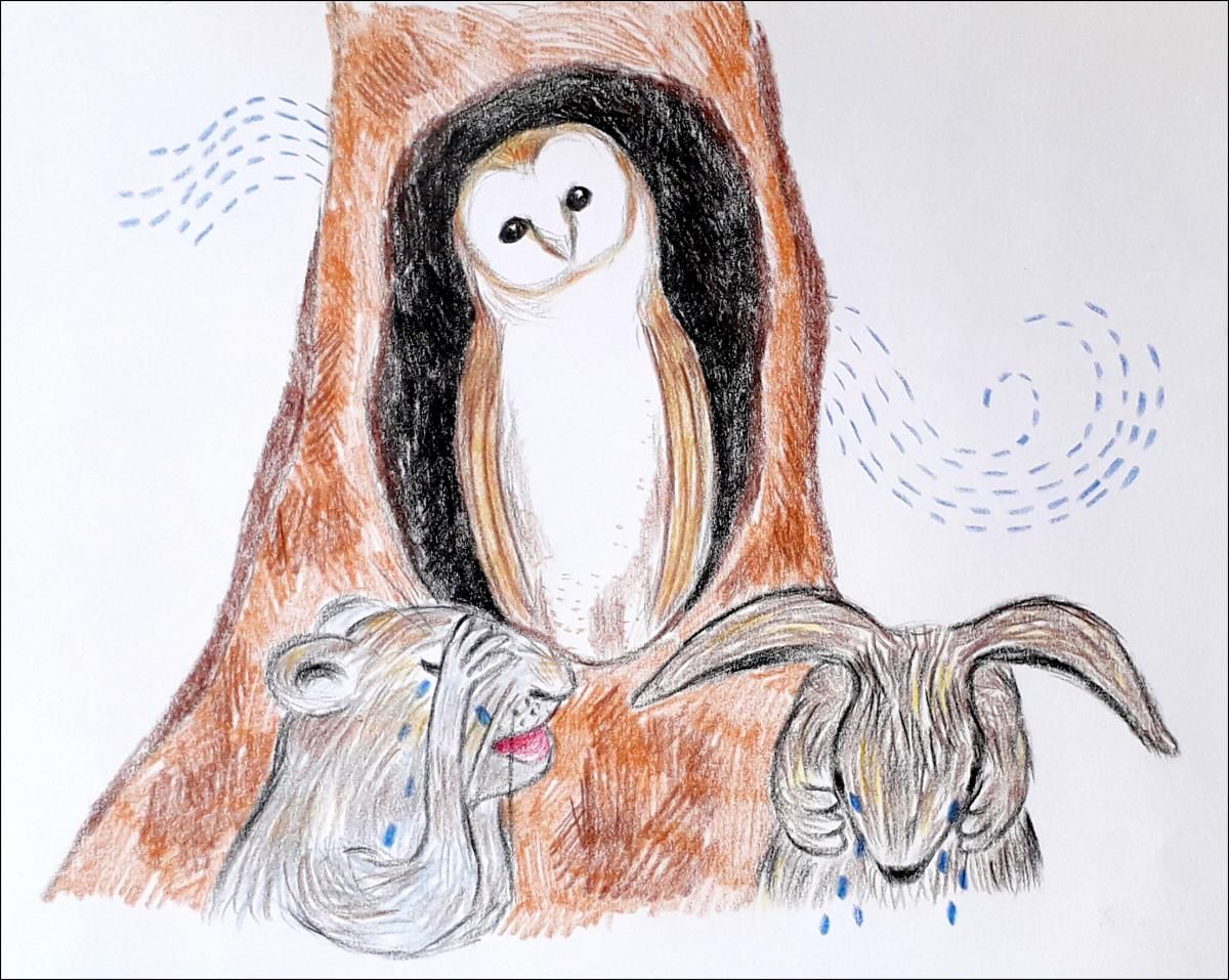 “चला तुम्हाला गोष्ट सांगतो”, त्यांच्या गोंधळलेल्या चेहऱ्यांकडे बघून घुबड म्हणले. गोष्ट म्हणल्यावर ससा आणि खारुताई लगेच सांगा सांगा म्हणून झाडाजवळ फतकल मारून बसले.