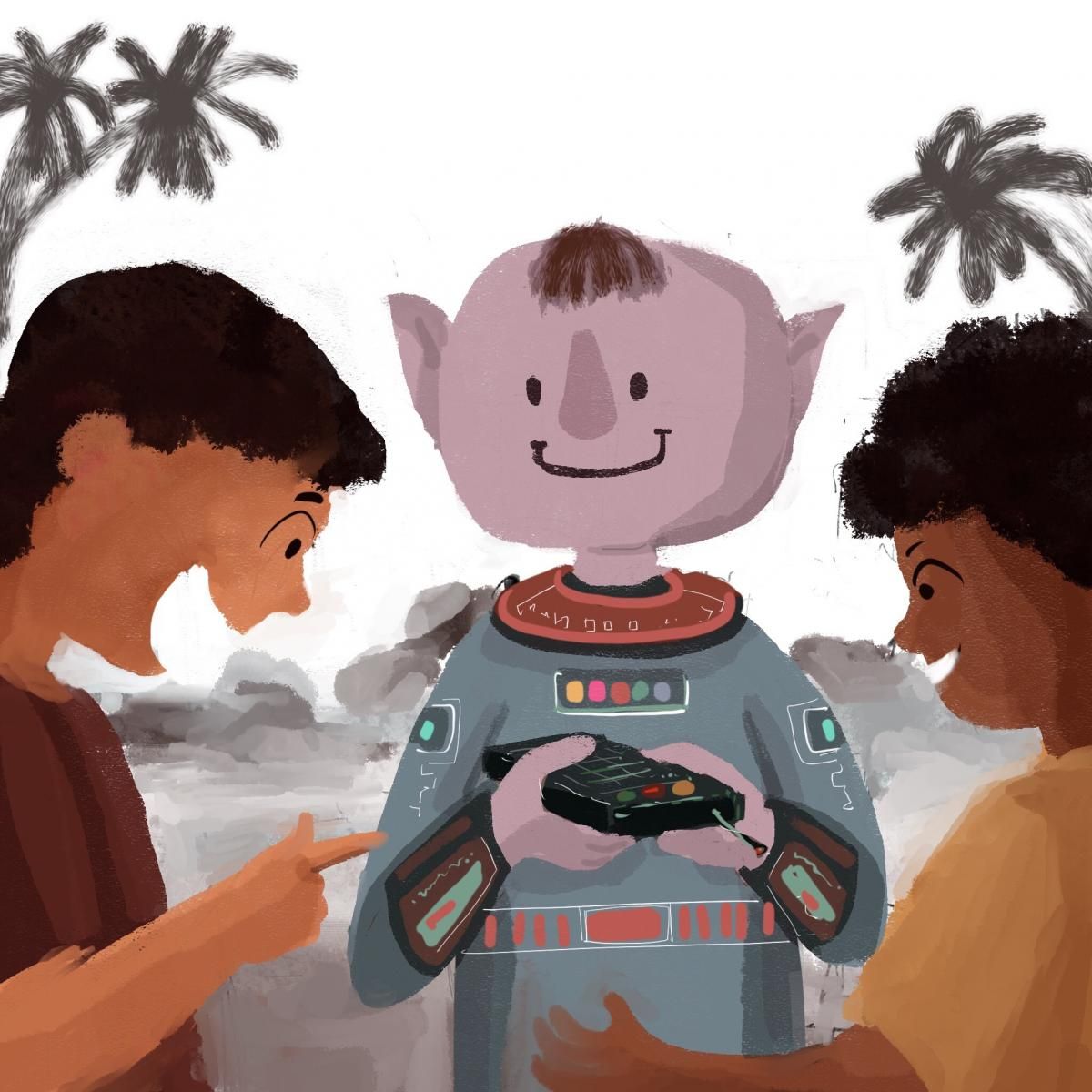 “ए हे काय आहे?” पुन्हा एकदा त्या यंत्रावरील दिव्यांची उघडमीट झाली. यंत्राने राजूचा प्रश्न त्या मुलापर्यंत पोहोचवला. त्या छोट्या पाहुण्यानेही तत्परतेने उत्तर दिलं. “हे यंत्र म्हणजे एक छोटासा बहुभाषा आहे. तुम्ही जे काही बोलता, त्या ध्वनिलहरी हा आत्मसात करतो व त्या ध्वनिलहरींचे माझ्या भाषेत रूपांतर करून, तुमचं बोलणं तो माझ्यापर्यंत पोहचवतो. याच पद्धतीने माझं बोलणं तुमच्यापर्यंत पोहोचवतो. अर्थात त्यासाठी काही सांकेतिक बटणं मात्र दाबावी लागतात.” रोमाच्या हातातील ते यंत्र पाहून राजू आणि संजू विलक्षण खूश झाले. असं यंत्र त्यांनी कधीच पाहिलं नव्हतं.