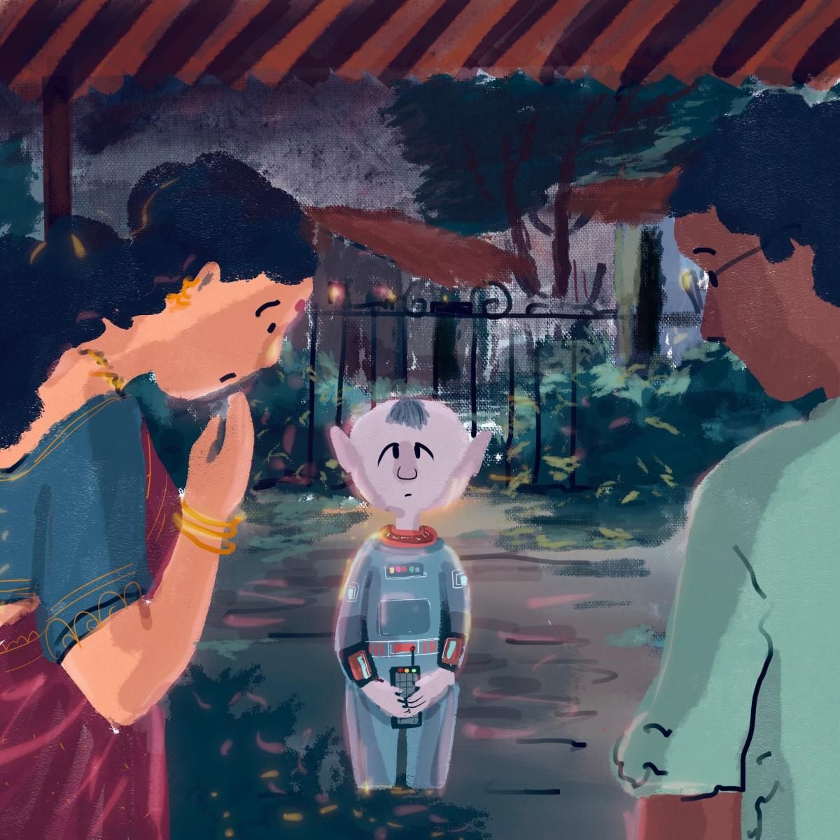 दोघे धावत त्याच्या जवळ गेले. पण, दोघांना समजेना याला हाक काय मारायची. दोघे काही वेळ तसेच उभे राहिले. एवढ्यात त्या पाहुण्याचं त्यांच्याकडे लक्ष गेलं. राजू झटकन पुढे झाला. “हॅलोऽ मी राजू. हा संजू. आम्ही दोघं या गावातच राहतो.” त्या मुलाने या दोघांकडे पाहिलं. त्याच्या हातात एक कॅलक्युलेटरसारखा एक यंत्र होतं. त्या यंत्रावर त्याने काही बटणं दाबली आणि अहो आश्चर्यम! त्या यंत्रातून चक्क मराठी शब्द बाहेर पडले.