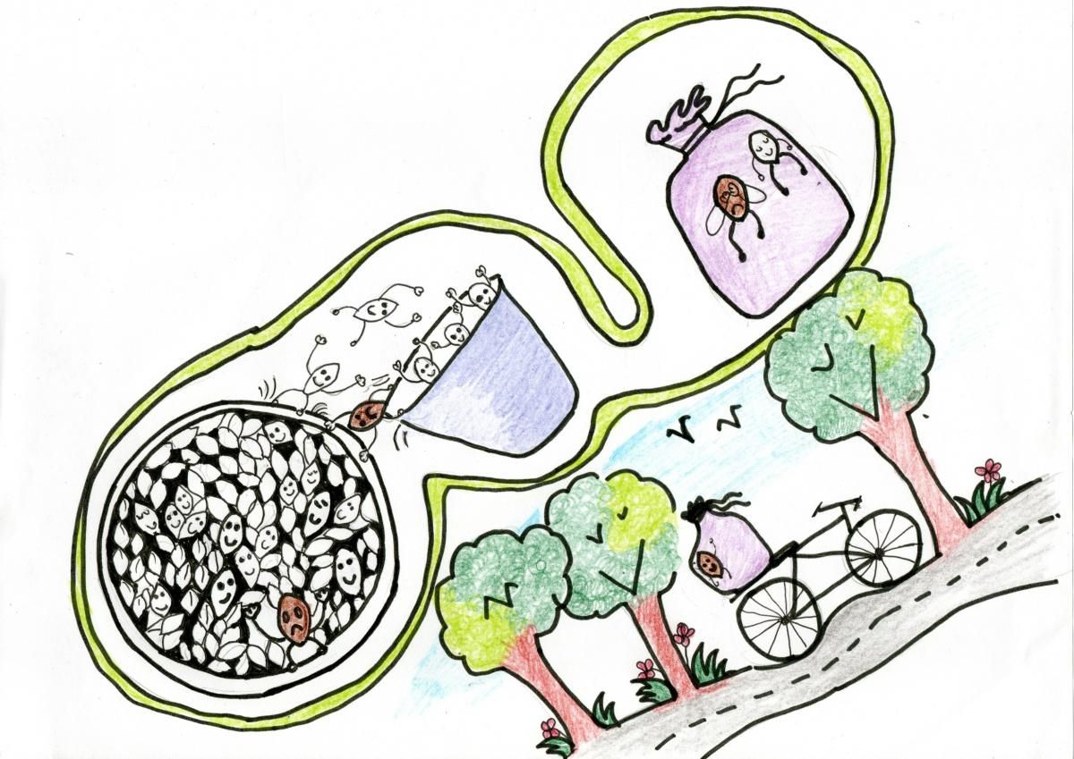 तिने ह्ळूच पिशवीच्या बाहेर पाहण्याचा प्रयत्न केला. शेतकरी जोरात सायकल चालवत होता. भरभर मागे पडणारा रस्ता, पळणारी झाडं, फांद्याफांद्यावरून उडणारे पक्षी, मधेच दिसणारा एखादा प्राणी बघण्यात चिमुकली बी स्वतःचे रडणे काही वेळ विसरली. तेवढ्यात परत एक धक्का बसला आणि दुसऱ्या क्षणी सगळ्या बिया अंगणातल्या पोत्यावर मनमोकळ्या पसरल्या. चिमुकली बी भानावर आली. बाकी सगळ्या बियांचे हसणे खिदळणे चालूच होते, पण चिमुकली बी मात्र अजूनही लपण्याचा प्रयत्न करत होती.