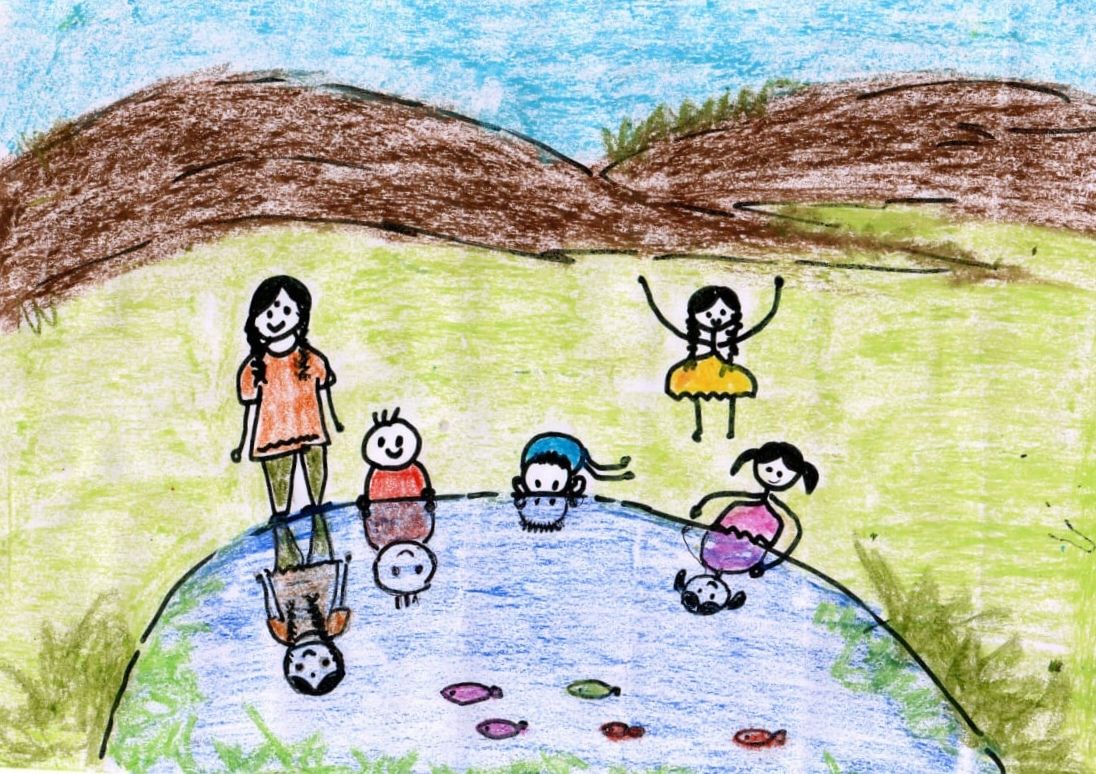 तेवढ्यात मुलांनी मॅडमना ओढून झऱ्यावर नेले. झऱ्याचं पाणी इतकं निवळशंख होते, की पाण्याखालचे खडक, त्यावरचं हिरवट शेवाळ्याचे पांघरूण, पाण्यात पोहणारे छोटे, छोटे मासे, एखाद-दुसरं बारकं झुडुप सगळं काही स्पष्ट दिसत होतं. माशांवर डोळा ठेवून शेजारच्या झाडावर बसलेल्या खंड्याने तेवढ्यात पाण्यात सूर मारला. त्याचे निळे पंख उन्हात झळाळले. वर उडाला तेव्हा त्याच्या चोचीत एक बारकासा मासा फडफड करत होता. मुले आणि मॅडम झऱ्यात उभे राहिले. थंडगार पाण्याने त्यांना बरं वाटलं. त्यांनी चेहरा धुतला. उन्हाने तापलेलं डोकं नि डोळे निवले. मुलांनी एकमेकांच्या अंगावर पाणी उडवलं. सुरकीच्या हातून चुकून पाटील मॅडमच्या अंगावर पण उडलं. तिनं जीभ चावली. पाटील मॅडमनी तिच्याकडे हसून पाहिले आणि उलटं तिच्या अंगावर उडवले. तिला ते फार आवडले. सगळ्याच मुलांना. मग सगळ्यांनी पाणी उडवून उडवून पाटील मॅडमना पार भिजवून टाकलं. मॅडम पण काही कमी नव्हत्या. त्यांनी पण जोरदार फेकाफेकी खेळली.