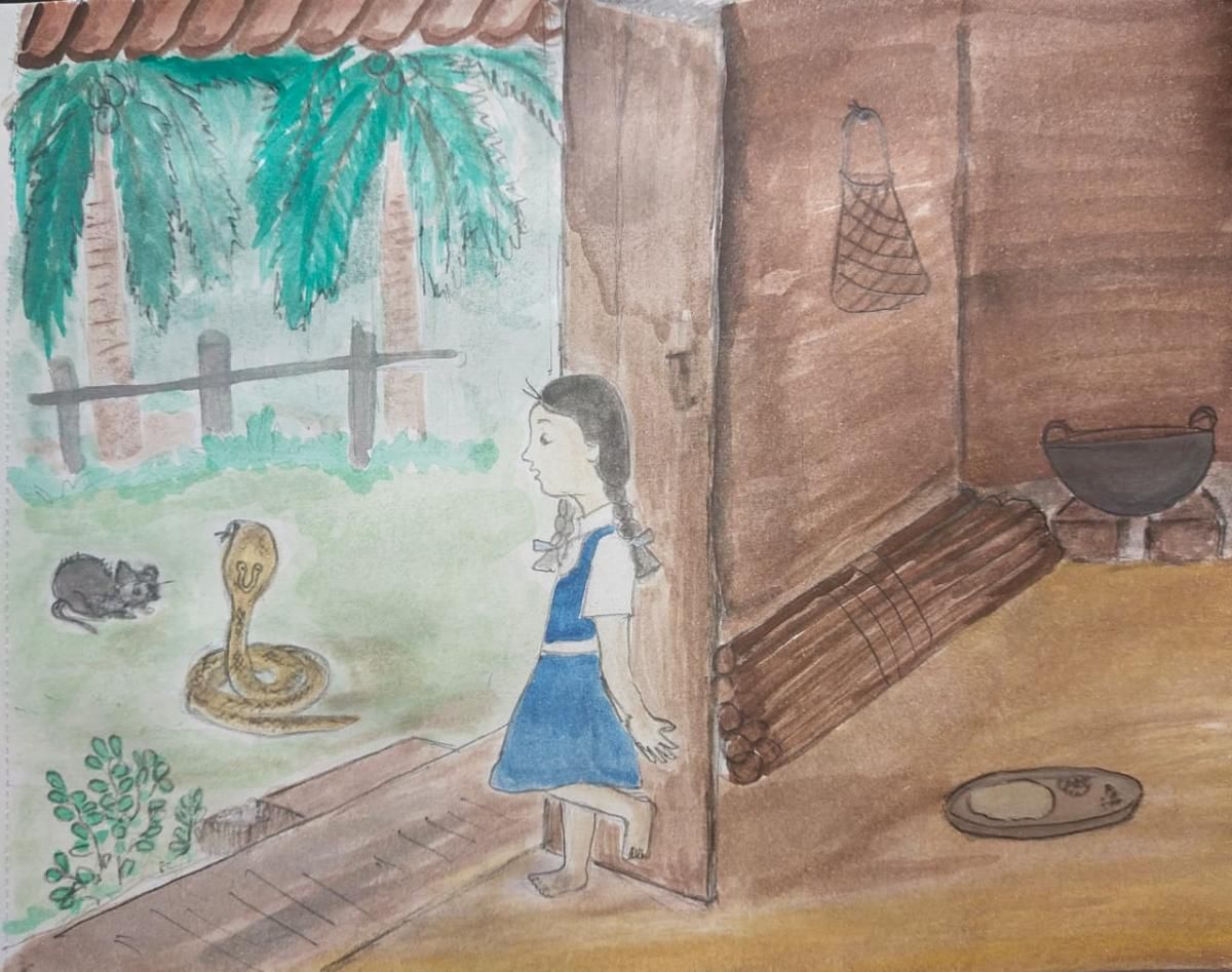 तरअगागागागा! सारिकाचे डोळेच क्षणभर पांढरे झाले. बाबा ज्याला सोयरा म्हणायचा तो तिथं अंगणात होता. फणा काढून, वेटोळं घालून उभा होता. चांगला दंडाएवढा जाड आणि बाबाच्या पंजाएवढा तर त्याचा फणा असेल. काळ्या ढगाच्या आडून आलेली उन्हाची तिरीप त्याच्या पिवळ्याधम्मक अंगावर पडली होती आणि त्यात ते चमचमत होतं. सारिका खिळल्यासारखी पाहात उभी राहिली. तेवढ्यात “चींचीं” असा एक बारीक आवाज आला. समोर एक गलेलठ्ठ उंदीर पायातली शक्ती गेल्यासारखा बसला होता. इतक्या वेळ सारिकाला तो दिसलाच नव्हता. दोन-तीन मिनिटं तशीच गेली. जणू मंतरच घातला होता त्या उंदरावर त्याने. अन् क्षणार्धात त्याचं वेटोळं सुटलं, चपळ हालचाल झाली आणि पुढच्याच क्षणी उंदीर त्याच्या तोंडात होता. त्यानं तो गिळून टाकला. त्याचं जेवण झालं.