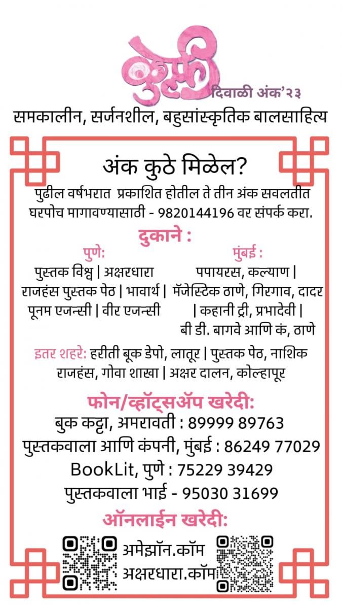२. केवळ दिवाळी अंक हवा असेल तर तो पुढील दुकानांत उपलब्ध आहे. शिवाय अमेझॉन आणि अक्षरधाराच्या वेबसाइटवरही अंक उपलब्ध आहे.